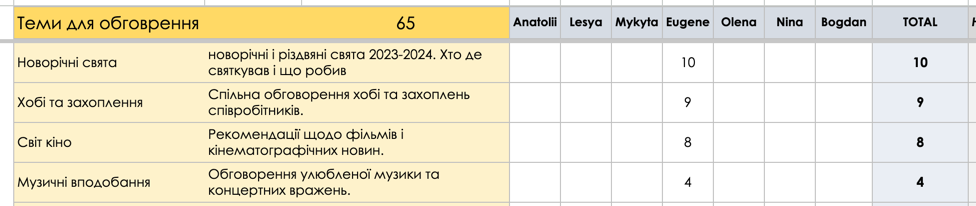 Ці теми можуть бути адаптовані залежно від інтересів та вподобань вашої команди. Регулярне залучення співробітників до обговорення тем і організація різноманітних ігор та активностей допоможе підтримувати зацікавленість та згуртованість команди.